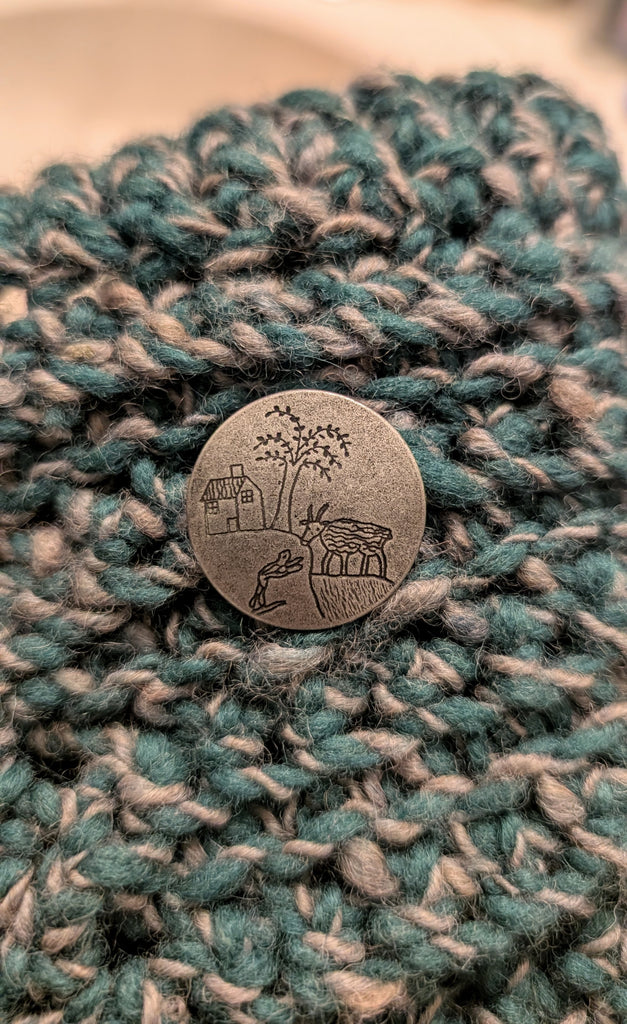 The light violet yarn is hand spun and hand-dyed with Virginia creeper berries and black hollyhocks. It's from the final fleece of our sweet alpaca, Patch. It's plied with a gorgeous yarn from the yarn store, Handwork. The cute pewter button with a little goat is from a yarn shop in Savannah, Georgia.